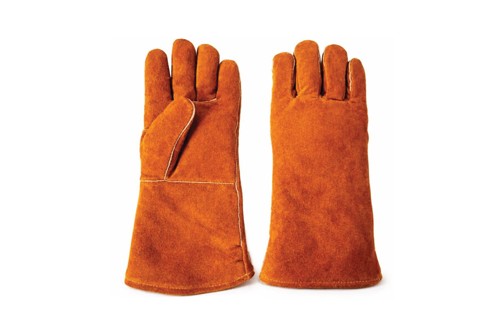 Heavy-duty split leather gloves with extended cuffs for maximum heat protection.