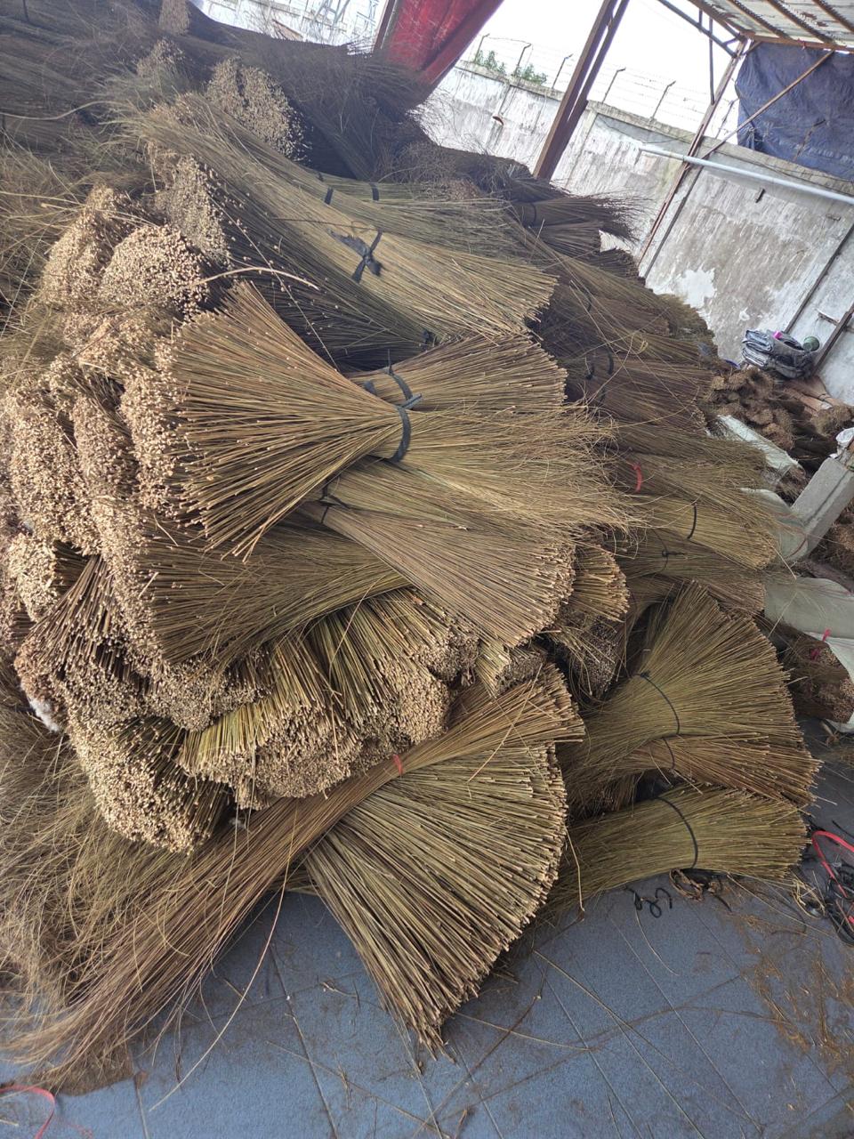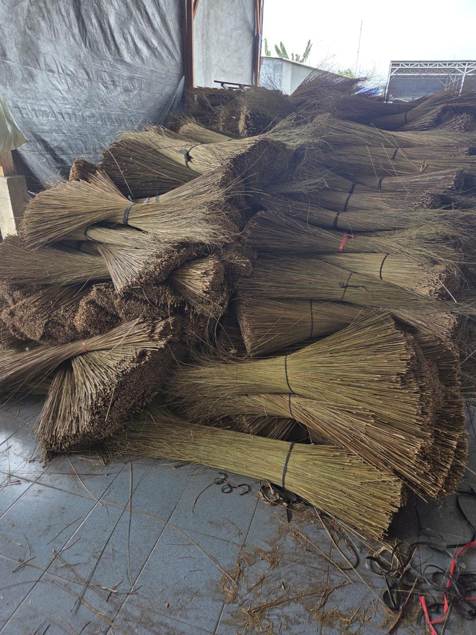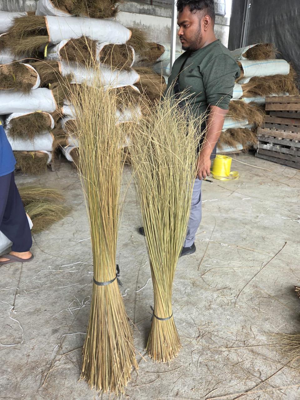 Palm broom sticks are typically made from natural palm fronds, coconut leaf ribs, or grass fibers that are tightly bound together to form a durable sweeping tool.