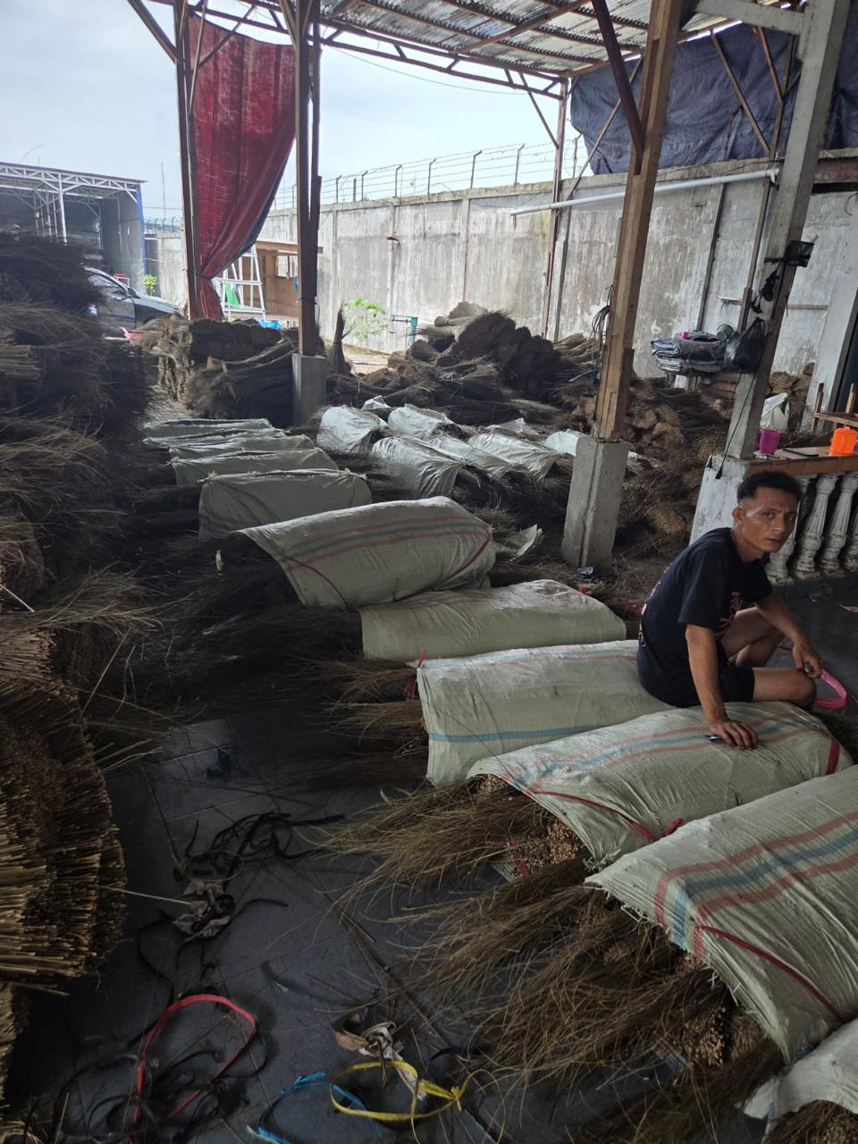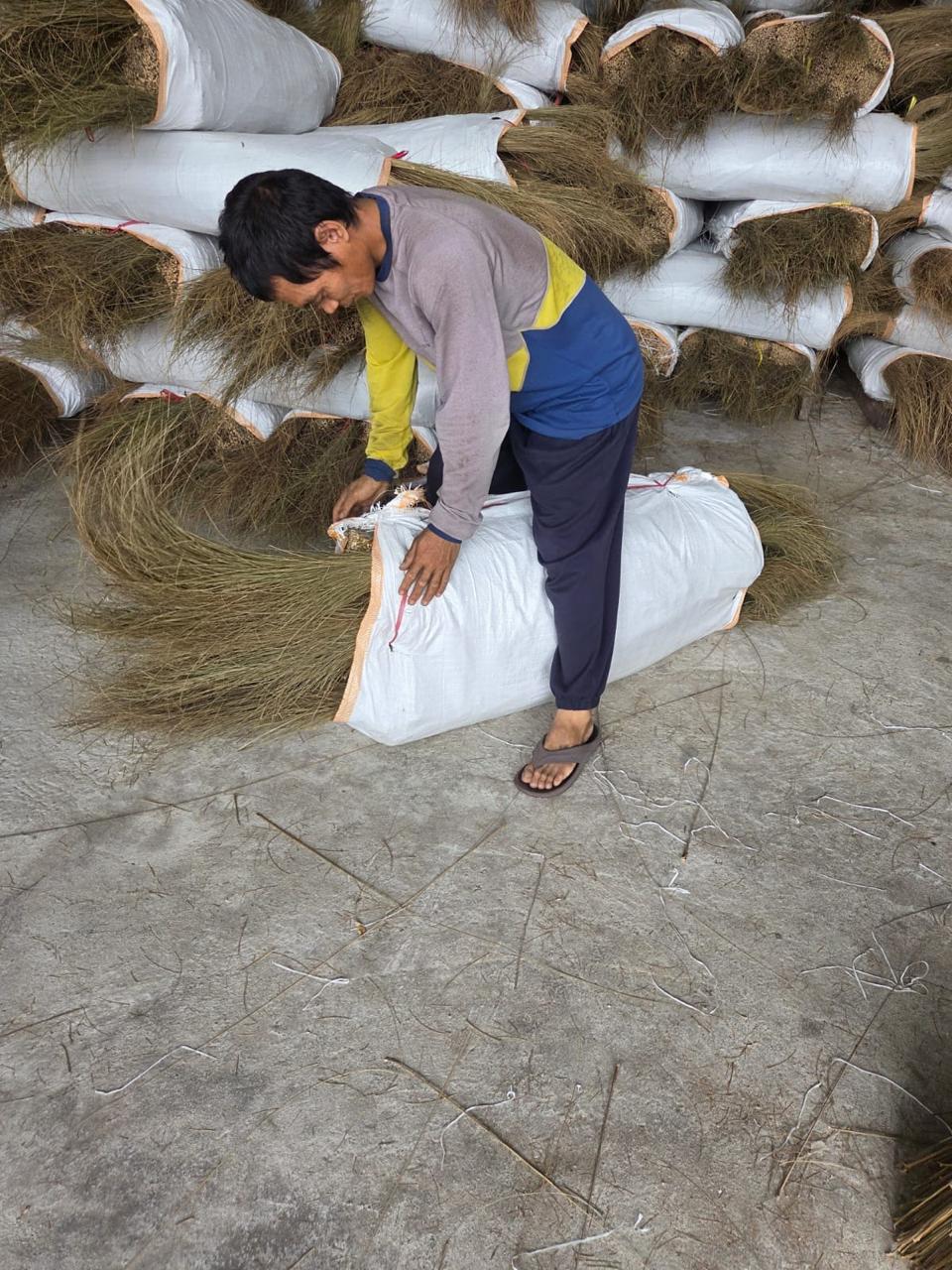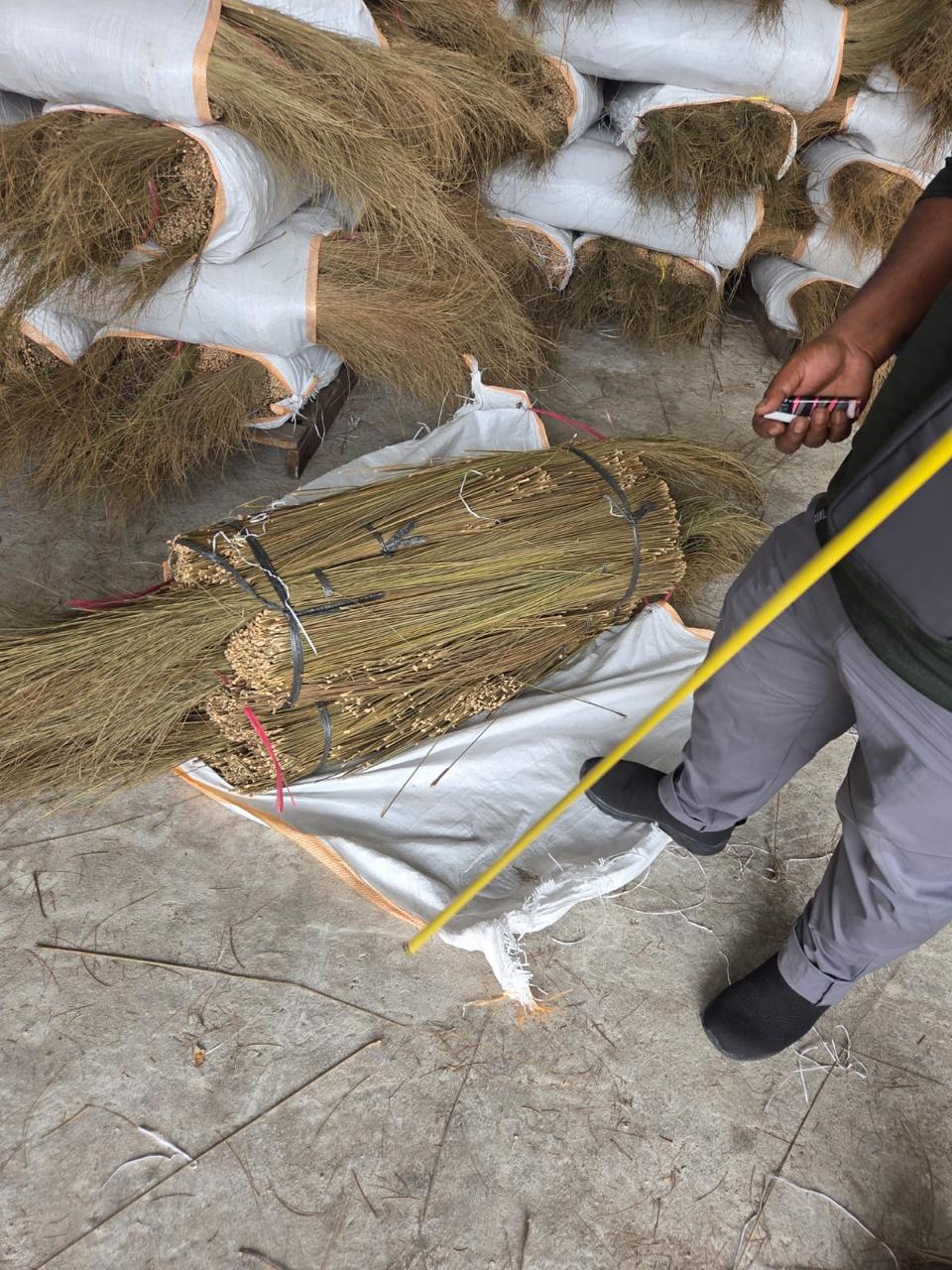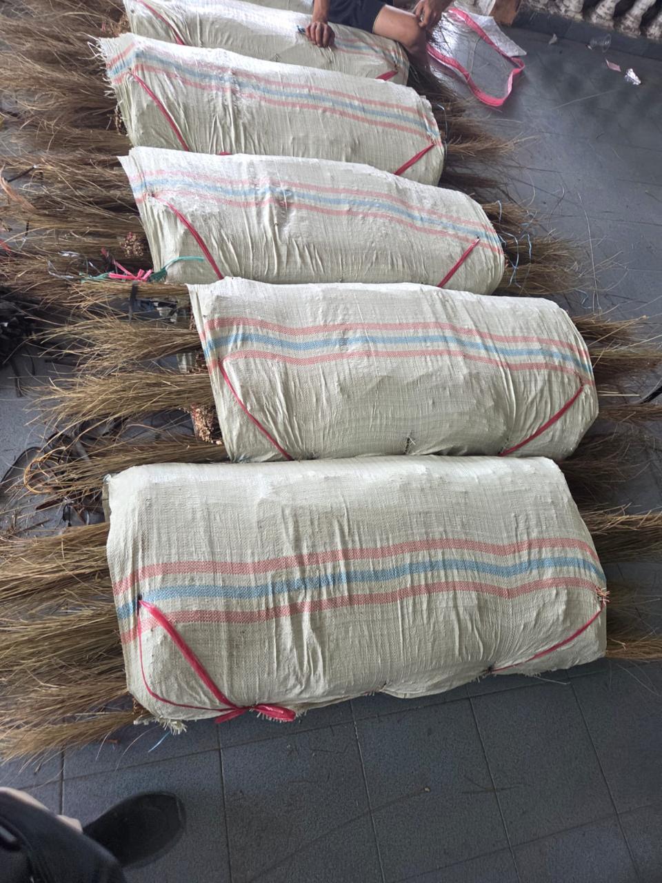Palm broom sticks are typically made from natural palm fronds, coconut leaf ribs, or grass fibers that are tightly bound together to form a durable sweeping tool.